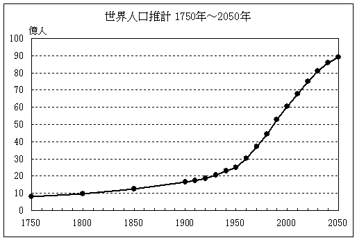 下の図はこの世界人口推計を1750年以降についてグラフにしたものであるが,近代に入って人口が急増しはじめ,特に第二次世界大戦後に人口増加は加速度的になっていることが明白に示されている(2000年以降は予測値,なお,このグラフは人口増加の趨勢を視覚的に明確に示すために,各年の数値を直線で結んで作成したものであり,実際の人口が直線的に増加したわけではない)。