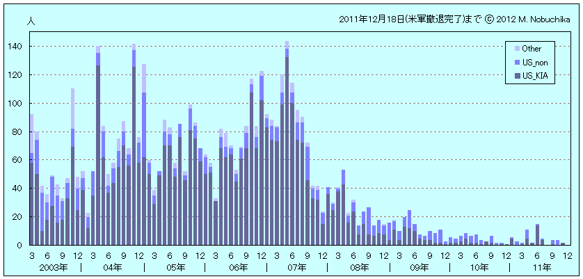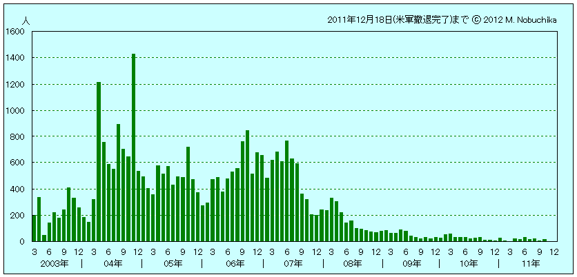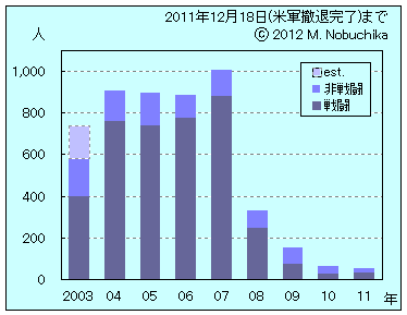 2011年12月でイラク駐留米軍が撤退しましたので,米軍の死傷者数は国防総省発表で変更があった時点で更新しています。