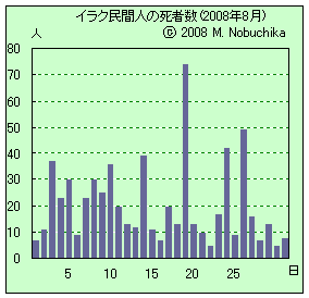 | 8.24 | バグダッド東部ルサファ地区でパトロール中の内務省治安部隊へのIED時間差攻撃により民間人2人死亡,治安部隊員7人含む13人負傷。(M) バグダッド西郊アブグレイブ地区で自爆攻撃により覚醒評議会メンバー含む25人死亡,29人負傷。(AP) バグダッド中心部ナハダ地区で警官隊への2発のIED攻撃により警官4人死亡,15人負傷。(R) ディヤラ州バラドルツでIED攻撃によりイラク兵4人死亡,8人負傷。(R) バクバ中心部の警察検問所を武装集団が攻撃,警官2人死亡,6人負傷。(R) バクバ南東でIEDにより4人死亡,5人負傷。(R) |