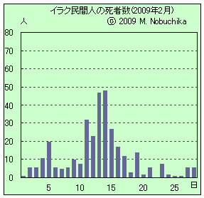 | 2.13 | バビル州イスカンダリヤでカルバラへ向かうシーア派巡礼者の集団内で女性が自爆,巡礼者ら40人死亡,84人負傷。(AP)(R) バグダッド西部で武装集団が国防省職員宅を襲撃し小区員1人と息子1人死亡。(R) モスル北部のイラク軍検問所で武装集団の銃撃によりイラク兵3人負傷。(R) モスル東部で少女1人の射殺体発見。(R) |