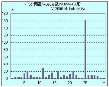 | 10.19 | 二ナワ州クウェストで米軍車両へのIED攻撃により米兵1人死亡,2人負傷。(M)(D) バグダッド南西部バヤー地区のレストランで爆弾攻撃により1人死亡,10人負傷。(R) バグダッド北部シャアブ地区でバスに仕掛けられた爆弾により1人死亡,8人負傷。(R) アンバル州東部ガルマで警官隊標的の自動車爆弾攻撃により警官4人負傷。(R) モスル北部で車に仕掛けられた爆弾により元イラク軍将校1人死亡。(R) モスル北部のイラク軍募集所に迫撃砲段が着弾し4人負傷。(R) モスル東部で銃撃により民間人1人負傷。(R) キルクーク中心部で警察高官の車に仕掛けられた爆弾により護衛官2人負傷。(R) モスル西部でイラク軍の作戦行動により武装勢力1人死亡,イラク兵1人負傷。(AP)(R) バグダッド東部でIED攻撃により警官1人と民間人2人負傷。(R) モスル南東部で2人の絞殺体発見。(R) |