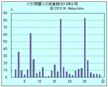 | 8.16 | ディヤラ州ミクダディヤでイラン人巡礼者のバス近くで自動車爆弾攻撃によりイラン人4人とイラク人1人死亡,10人負傷。(R) ファルージャ近郊で走行中の車からの銃撃により州議会議員の親戚1人死亡。(R) モスル中心部の検問所への銃撃により警官1人死亡。(R) モスル東部で武装勢力容疑者追跡中のイラク兵の発砲により民間人1人死亡,1人負傷。(R) |
