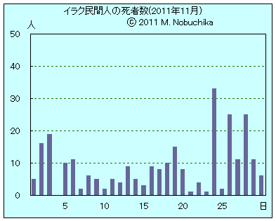 | 11.21 | モスル東部で武装集団が警官宅を襲撃し警官1人死亡。(R) バグダッド北部アダミヤ地区で警官隊標的のIED攻撃により民間人4人負傷。(R) モスル東部でIED攻撃によりイラク兵1人負傷。(R) |