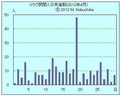 | 4.12 | キルクーク南方で警官隊への銃撃により警官2人死亡,警官3人含む5人負傷。(AP) ファルージャ東部カラマ地区でIED攻撃により警官1人死亡,2人負傷。(AK) モスル中心部で警官隊標的の手榴弾攻撃により民間人3人死亡,2人負傷。(AK) ラマディ東部の警察署入り口で自動車爆弾攻撃により警官1人死亡,3人負傷。(AK) バグダッド中心部で車に仕掛けられた爆弾により警官1人死亡,1人負傷。(AK) モスルの検問所への武装集団の攻撃により警官2人死亡。(AK) モスルで2人の射殺体発見。(AK) キルクーク南部でバドル党(前イラク・イスラム最高評議会軍事部門のバドル軍団)高官の車に仕掛けられた爆弾が爆発,高官は無事。(AK) |