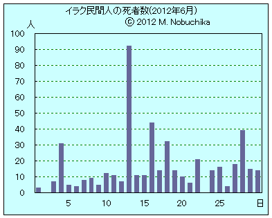 | 6.18 | バクバでシーア派部族長の葬儀会場での自爆攻撃により治安部隊員含む16人死亡,36人負傷。(NINA)(AP) バクバ北方の警察検問所への武装集団の攻撃により警官1人死亡,2人負傷。(NINA) アンバル州東部シュワイランで武装集団の銃撃により警官1人とその血縁者1人死亡。(NINA) モスル東部で武装集団の銃撃により警官1人死亡。(NINA) バビル州ムサイブで武装集団が警察情報提供者の家を襲撃し情報提供者1人死亡。(NINA) ヒートの警察検問所への武装集団の機関銃攻撃により警官3人負傷。(NINA) モスル南方の警察検問所への武装集団の攻撃により警官2人負傷。(NINA) |