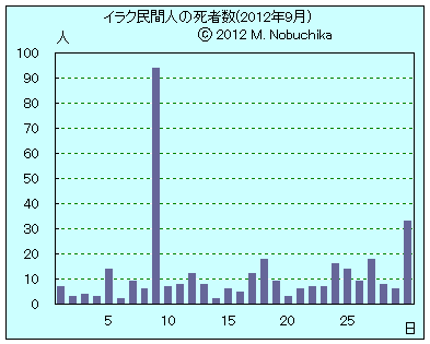 | 9.29 | バクバ東方バラドルツで警察車両標的の自動車爆弾攻撃により警官2人死亡,4人負傷。(NINA) バグダッド北郊タルミヤでイラク軍検問所への武装勢力の攻撃によりイラク兵1人死亡,2人負傷。(NINA) ニナワ州北西部シンジャルで武装集団の銃撃によりヤジディ教徒2人死亡,4人負傷。(NINA) ファルージャ東方カルマで検問所近くでのIED攻撃により民間人1人死亡,警官1人負傷。(NINA) モスル東方ヤブ・ユニスでIED攻撃により民間人4人負傷。(NINA) タルアファルでIED攻撃により警官3人負傷。(NINA) |