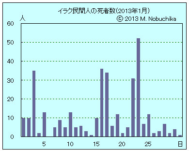 | 1.12 | バイジでIED攻撃により警官1人死亡,3人負傷。(NINA) ファルージャ近郊のイラク軍部隊司令部内に迫撃砲弾2発が着弾。(NINA) モスル南方カイヤラで男性3人の射殺体発見。(NINA) サラハディン州北部シャルカットでIED攻撃により警官2人と民間人1人負傷。(NINA) ファルージャ北郊でイラク軍部隊標的のIED攻撃,死傷者無し。(NINA) バグダッド中心街で2000人規模のマリキ政権支持デモ。(AP) |