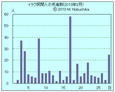 | 2.15 | ラマディ・ファルージャ,サーマッラ,モスル,キルクークなどスンニ派居住地域とバグダッドのスンニ派モスクでマリキ・シーア派政権のスンニ派差別に対する数万人規模の抗議行動。(AP) バイジで近郊の村で武装集団の銃撃により警官1人死亡。(NINA) モスル西方バドシュ地域の検問所への武装集団の銃撃によりイラク兵2人負傷。(NINA) |