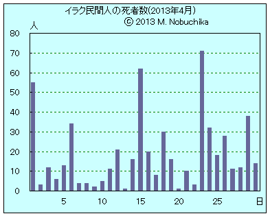 | 4.27 | ファルージャ北部の鉄道駅近くで武装勢力と国家警察との戦闘が再発,民間人3人と警官1人負傷。(NINA) ラマディの反政府抗議行動広場そばで武装集団がイラク軍情報部車両を停車させ銃撃戦,情報部員5人死亡,武装集団2人負傷。(AP)(NINA) バクバ北東部で過去3日間の治安部隊による予防的武装勢力掃討作戦により武装勢力10人死傷,治安当局発表。(NINA) バスラで3件の銃撃事件により3人死亡。(NINA) ファルージャ南部でサッカー練習中の青年たちへの武装集団の銃撃により民間人1人死亡,1人負傷。(NINA) |
