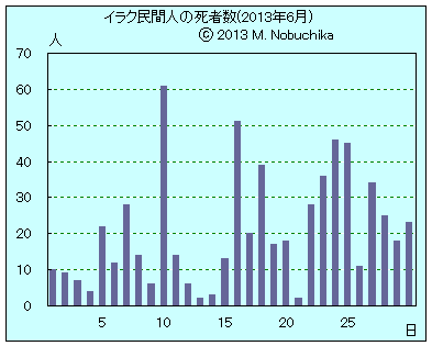 | 6.13 | モスル東部でニナワ州知事の車両標的の自動車爆弾による自爆攻撃により通行人2人死亡,護衛官3人負傷,知事は無事。(AP)(NINA) モスル北西ラビア地域でIED攻撃により警官3人負傷。(NINA) |