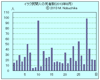 | 8.16 | バグダッド西部ガザリヤ地区のサッカー場近くでIED攻撃により5人死亡,15人負傷。(AP)(NINA) バビル州北部マフムディヤでIED攻撃によりイラク兵2人死亡。(AP) バクバ北東ミクダディヤで武装集団の銃撃により警察幹部1人と護衛官1人死亡。(NINA) モスル南部で武装集団の襲撃により警官1人死亡,兄弟1人負傷。(NINA) モスル西部で武装集団の銃撃によりモスク聖職者1人死亡。(NINA) |