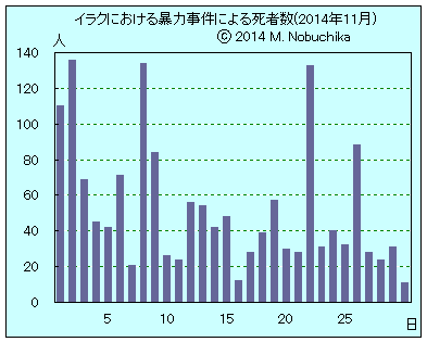 | 11.16 | バグダッド南西郊ラドワニヤ(スンニ派居住地区)でIED攻撃により警官2人死亡,5人負傷。(AP) バグダッド近郊ハイジャミ地区でIED攻撃により3人死亡,9人負傷。(AP) バグダッド国際空港近くの検問所への自動車爆弾攻撃により5人負傷。(AP)(R) バグダッド東部サドルシティで武装集団の銃撃により民間人1人死亡。(NINA) モスルでISが著名な貿易業者6人をISの税不払い容疑で逮捕。(NINA) キルクーク西方ハウィジャで有志連合国軍の空爆によりISメンバー11人死亡。(NINA) アンバル州西部ルトバ,ワディ,ヒート,ジャジーラ各地域を有志連合国軍が空爆,詳細未発表。(NINA) ティクリート東部で治安部隊の作戦行動によりISメンバー14人死亡,内務省発表。(NINA) |