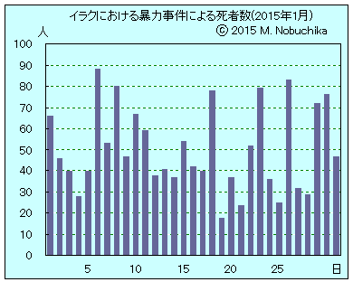 | 1.29 | バグダッド北郊ミシャハダのシーア派民兵司令部内での2人の自爆攻撃により民兵7人死亡,21人負傷。(AP)(R) バグダッド北郊タルミヤの検問所への自動車爆弾攻撃により警官3人と民間人1人死亡,11人負傷。(R) バグダッド西郊アブグレイブの検問所への武装集団の銃撃によりイラク兵3人死亡,8人負傷。(AP)(R) バビル州北部ユシフィヤでIED攻撃により4人死亡,12人負傷。(AP)(R) バビル州北部マフムディヤでIED攻撃により2人死亡,10人負傷。(AP)(R) ティクリートでISが治安部隊員22人を処刑。(NINA) ティクリート南方ディジラで家屋に仕掛けられた爆弾により民衆動員兵9人死亡,4人負傷。(NINA) モスルでISが女性12人を処刑。(IB) バイジでISが民間人10人を処刑。(IB) ティクリート東部で迫撃砲攻撃により民間人4人死亡。(NINA) バクバ西部で武装集団の銃撃によりサフワ・メンバー1人死亡。(NINA) バグダッド中心部で男性1人の射殺体発見。(NINA) モスル地域でISの攻撃に対するペシュメルガの軍事行動によりIS戦闘員30人死亡。(NINA) ラマディ南部と北部地域を治安部隊がISから奪還しラマディの90%がIS支配から解放,アンバル州作戦司令部発表。(NINA) アンバル州西部ルトバ地域で有志連合国軍の空爆によりISメンバー16人死亡,北部ハディサ地域への有志連合国軍の空爆によりISメンバー11人死亡。(NINA) モスル空港とガズラニ軍事基地への有志連合国軍の空爆によりISメンバー18人死亡。(NINA) ティクリート西部地域で治安部隊の軍事行動によりISメンバー26人死亡。(NINA) |