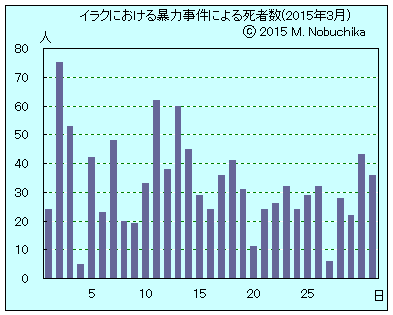 | 3.15 | バグダッドの米国大使館が13日のラマディでの有志連合国軍機の誤爆によるイラク兵50人の死亡情報について,該当日時・場所で米軍機は攻撃に参加していないと発表。(IN) ティクリート東方アルブ・アジール地域で赤い服を着せられた約20人の死体発見。(IN) モスル中心街でISがメンバー4人をイスラム法に反する行為で処刑。(IN) アンバル州中部地域でISの迫撃砲攻撃により民間人1人死亡,2人負傷。(IN) ラマディ東郊カリディヤ地区で治安部隊の作戦行動によりIS戦闘員5人死亡。(IN) ティクリートでの治安部隊・シーア派民兵の対IS軍事作戦に参加するためにサドル師配下の民兵部隊がサーマッラを出発。(AP) ラマディ中心部でISの無差別砲撃により民間人4人死亡,12人負傷。(NINA) バビル州北部で武装集団の銃撃により民間人2人負傷。(NINA) ティクリート中心部の大統領宮殿入り口でイラク軍の空爆によりISメンバー18人死亡。(NINA) ティクリート西方地域で治安部隊・民兵部隊の作戦行動によりISメンバー5人死亡,10人負傷。(NINA) アンバル州各地でのイラク軍の空爆を含む作戦行動によりISメンバー38人死亡。(NINA) ラマディ地域で有志連合国軍の空爆によりISメンバー7人死亡。(NINA) ファルージャ東郊カルマで治安部隊の作戦行動によりISメンバー18人死亡。(NINA) |
