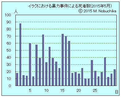 | 5.29 | バグダッド東部でIED攻撃により通勤バスの乗客3人死亡,10人負傷。(AP) バグダッド西部で武装集団の銃撃により民間人1人死亡。(NINA) サラハディン州ティグリス川東岸で警察特殊部隊の作戦行動によりISメンバー11人死亡。(NINA) ファルージャ東郊カルマで治安部隊の作戦行動によりIS戦闘員12人死亡。(NINA) ラマディ地域でイラク軍の空爆を含む作戦行動によりIS戦闘員16人死亡,9人負傷。(NINA) サーマッラ西部地域でイラク軍の空爆を含む作戦行動によりISメンバー24人死亡。(NINA) ティクリート南方ドゥジェイル,サーマッラ,サイエド・ガリブ地域で治安部隊・部族民兵部隊の作戦行動によりISメンバー10人死亡。(NINA) ティクリート東部地域で治安部隊の作戦行動によりISメンバー3人死亡。(NINA) アンバル州西部カイム地域でのイラク軍情報部隊の作戦行動によりISの外国人指導者20人死亡。(NINA) |