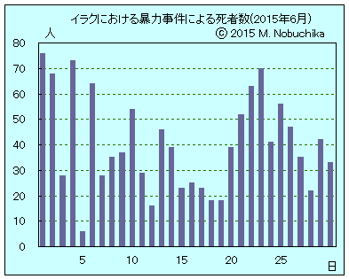 | 6.27 | バグダッド南東部で自動車爆弾攻撃により5人死亡,13人負傷。(AP) バグダッド東郊の市場でIED攻撃により3人死亡,8人負傷。(AP)(R) バグダッド南西部バヤア地区でIED攻撃により2人死亡,10人負傷。(AP) バグダッド南部ドーラ地区の市場でIED攻撃により2人死亡,3人負傷。(AP)(R) バグダッド中心部カラダ地区で自動車爆弾攻撃により民間人1人死亡,17人負傷。(NINA) アンバル州西部でイラク軍の砲撃によりISメンバー26人死亡。(NINA) モスル北方マクムール地域で有志連合国軍の空爆によりISメンバー10人死亡。(NINA) バイジで警官隊の作戦行動によりISメンバー8人死亡,2人逮捕。(NINA) アンバル州西部カイム地域でIS指揮官の会議標的のイラク空軍の空爆によりISメンバー28人死亡,15人負傷。(NINA)(IN) |