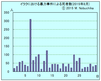 | 8.15 | [バグダッドおよび周辺地域で自動車爆弾やIED攻撃により24人死亡,46人負傷。 東部サドルシティで自動車爆弾攻撃により15人死亡,52人負傷,ISがイラク軍・民兵部隊標的の攻撃と実行声明。 南東郊マダインでIED攻撃により3人死亡,10人負傷。 北郊タージでIED攻撃により2人死亡,8人負傷。 アスカン地区でIED攻撃により2人死亡,8人負傷。 南東郊ジスル・ディヤラでIED攻撃により2人死亡,7人負傷。](AP)(R) モスルでISが女性15人を処刑。(IB) バクバ北東ミクダディヤで武装集団の銃撃によりイラク軍将校1人死亡。(NINA) モスルでISが指揮官含む戦闘員メンバー24人を戦場から逃亡したとして処刑。(NINA) ラマディ東郊フサイバで警官隊の作戦行動によりISメンバー29人死亡。(IN) ラマディ東郊フサイバで民衆防衛隊員の作戦行動によりISメンバー10人死亡。(NINA) サラハディン州北部シャルカットでイラク軍の空爆によりISメンバー125人死亡,70人負傷,治安当局発表。(IN) キルクーク南方地域で有志連合国軍の空爆によりISメンバー8人死亡,7人負傷。(IN) ファルージャでイラク軍のミサイル攻撃によりISメンバー5人死亡,8人負傷。(NINA) ティクリート東方アジル油田地域で治安部隊とISの戦闘によりIS戦闘員80人死亡。(NINA) バイジ地域で治安部隊の作戦行動によりISメンバー17人死亡。(NINA) ラマディ地域でイラク軍の空爆によりISメンバー16人死亡。(NINA) バイジで治安部隊の作戦行動によりISメンバー15人死亡。(NINA) |