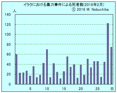 | 2.28 | バグダッド東部サドルシティの市場でIEDの爆発で集まった群衆への自爆攻撃により73人死亡,112人負傷,IS系武装勢力が実行声明。(AP)(R) バグダッド西郊アブグレイブの治安部隊施設へのIS戦闘員の機関銃やRPGと自爆攻撃により治安部隊員17人死亡,35人負傷,イラク軍ヘリの空爆によりIS戦闘員20人以上死亡。(AP)(R) バグダッド南部ドーラ地区でIED攻撃により4人死亡。(AP) バビル州北部マフムディヤでIED攻撃により3人死亡,10人負傷。(AP) サドル師が配下の民兵組織にバグダッドの防衛を指示。(R) アンバル州中部ヒートとクバイサのIS支配地域を治安部隊が攻撃態勢,アンバル州警察報道官が同地域の住民に対して48時間以内の避難命令を発令。(IN) ニナワ州西部のISガズラニ基地でISがメンバー35人を反逆罪で処刑。(IN) キルクークで武装集団がハーブ販売店主1人を射殺。(NINA) |