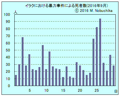 | 9.27 | バグダッド東部ニューバグダッド地区で自爆攻撃により民間人11人死亡,28人負傷,バグダッド南西部バヤア地区で自爆攻撃により民間人6人死亡,21人負傷,ISがシーア派民兵標的の攻撃と実行声明。(AP)(R) バグダッド西部ラドワニヤ地区でIED攻撃により民間人2人死亡。(R)(NINA) バグダッド北西シュラ地域でIED攻撃により2人死亡,8人負傷。(NINA) バグダッド南東郊マダインでIED攻撃により1人死亡,5人負傷。(NINA) |