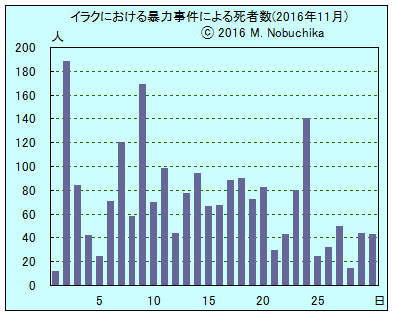 | 11.1 | 国連イラク派遣団(UNAMI)が10月の暴力事件によるイラク人死者は民間人(警官,サフワなど含む)1,120人と治安部隊員(ペシュメルガ,民兵など含む)672人,計1,792人,負傷者は民間人1,005人,治安部隊員353人,計1,358人と発表。(UNAMI) モスルのチグリス川東岸地域ゴジアリに対IS軍事作戦部隊が進攻,IS戦闘員35人死亡,イラク・メディ・ネットワークの建物を奪還しイラク国旗を掲揚。(AP)(AFP)(IN) 内務省がモスル解放作戦開始以来1440平方qをISの支配から解放しISメンバー1300人以上死亡と発表。(IN) モスル東方バルテッラ地域の2つの村をイラク軍が解放。(IN) モスルの病院からISが負傷した戦闘員数十名をシリア方面に移送。(IN) モスル西郊地域に対IS軍事作戦部隊が進軍。(IN) モスル西部シャララット地区で対IS軍事作戦部隊の作戦行動によりIS幹部1人と部下1人死亡。(IN) モスル西部地域の39の村をISの支配から解放したとシーア派民兵部隊が発表。(NINA) モスル中心街でイラク空軍の空爆によりIS幹部1人と護衛7人死亡。(NINA) モスル地域でイラクF-16戦闘機の空爆によりISメンバー29人死亡,25人負傷。(NINA) モスル中心部の病院へのイラク空軍の空爆によりISメンバー67人死亡。(NINA) キルクーク西方ハウィジャでIED攻撃により民間人4人死亡,9人負傷。(IN) バグダッド北郊タルミヤでIED攻撃により警官4人負傷。(NINA) |