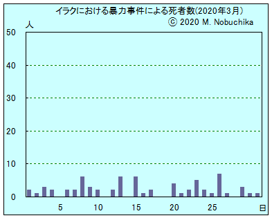 | 3.25 | イラク駐留フランス軍が新型コロナウイルスへの対応のために撤収すると発表。(AP)(R) バクバ北東地域でIED攻撃によりイラク兵1人死亡,1人負傷。(NINA) 北部ハフタニン地域でクルド労働者党(PKK)の迫撃砲攻撃によりトルコ軍兵士2人死亡,2人負傷。(R) |