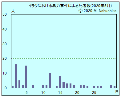 | 5.10 | カジミ新首相が拘置所に収容中の反政府抗議参加者を釈放すると発表。(AP) バビル州北部ジュルフ・アルナスルでISの狙撃によりシーア派民兵1人死亡。(NINA) バクバ北東サアディヤ地域で武装集団の銃撃により民間人1人死亡。(NINA) バクバ北東ミクダディヤ地域の農地にISが放火,駆け付けた消防隊にISが発砲し消防士2人負傷。(NINA) モスル南方カイヤラ地域で迫撃砲攻撃により民間人3人負傷。(NINA) バクバ北東カナキン地域でISが農夫2人を誘拐。(NINA) モスル南方カイヤラ地域で治安部隊がISの残存勢力掃討作戦を実施。(NINA) ディヤラ州北東部でイラク軍の作戦行動によりISメンバー2人死亡。(NINA) |