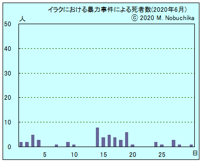 | 6.20 | バクバ北東ミクダディヤ郊外でISの狙撃によりシーア派民兵1人死亡。(NINA) モスル南方カイヤラ地域でIED攻撃により民間人2人負傷。(NINA) モスル西方マハラビア地区で治安部隊がISメンバー6人を逮捕。(NINA) 北部ハフタニ地域でクルド労働者党(PKK)がトルコ軍特殊部隊の空挺作戦を撃退しトルコ軍兵士20人死亡と発表。(NINA) |