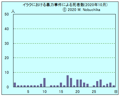 | 10.23 | NATOのストルテンバーグ事務総長が加盟国の国防相とのオンライン会議後の記者会見でイラクにおけるNATO軍の増派で合意したと発表。(NINA) バクバ北東アブサイダ地区で武装集団の銃撃により民間人1人死亡。(NINA) バクバ北東ミクダディヤ郊外でIED攻撃によりイラク軍将校1人と兵士1人負傷。(NINA) サラハディン州でIED輸送中の爆発によりISメンバー4人死亡。(NINA) ニナワ州各地での治安部隊の作戦行動によりISメンバー10人逮捕。(NINA) タルアファルで治安部隊がISメンバー4人を逮捕。(NINA) キルクーク地域で治安部隊の作戦行動によりISメンバー5人逮捕。(NINA) |
