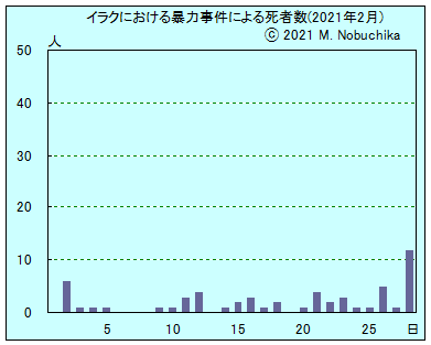 | 2.1 | バグダッド北東シャアブ地区の庁舎に手榴弾攻撃,死傷者なし。(NINA) モスル東部で警察がISメンバー3人を逮捕。(NINA) モスル旧市街で2016年のモスル奪還作戦時のISメンバー23人の死体発見。(NINA) バグダッド中心部カラダ地区のアルコール飲料販売店とマッサージ店標的にIED攻撃。(NINA) キルクーク西方ハウィジャ地域で警察がISメンバー1人を逮捕。(NINA) |