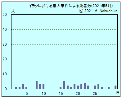 | 5.21 | バスラ中心部で武装集団の銃撃により民間人1人死亡,1人負傷。(NINA) バグダッド北郊タルミヤで武装集団の銃撃により民間人1人死亡。(NINA) バクバ北方クハリスで治安部隊が二輪車爆弾攻撃を阻止。(NINA) バスラ南部アルファウ地区のイスラム聖職者宅前でIEDが爆発,物的損害のみ。(NINA) |