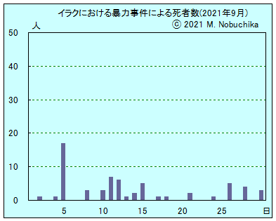 | 9.20 | サラハディン州とディヤラ州の境界地域で治安部隊がISの残存勢力掃討作戦を実施。(NINA) バビル州北部ジュルフ・アルナスルでシーア派民兵部隊がイラク軍の協力下で対IS軍事作戦治安作戦を実施。(NINA) モスル中心部で治安部隊がISの資金担当者1人を逮捕。(NINA) 北部地域でトルコ軍の作戦行動によりクルド労働者党(PKK)戦闘員3人死亡,トルコ国防省発表。(NINA) |