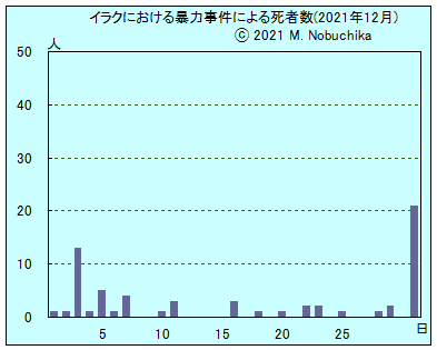 | 12.30 | バビル州北部ジャブレ地区で治安部隊がISメンバー容疑者宅を包囲し銃撃戦,容疑者の発砲により家族含む20人死亡,治安部隊員人負傷。(NINA) モスル東部で武装集団の銃撃により民間人1人死亡。(NINA) ニナワ州マクムール地区でイラク軍部隊がISの攻撃を撃退しIS戦闘員4人死亡,イラク軍の空爆を含む作戦行動によりISメンバー6人死亡。(NINA) タルアファル地域で治安部隊がISメンバー3人を逮捕。(NINA) サラハディン州とディヤラ州の境界地域でイラク軍の空爆によりISメンバー1人死亡。(NINA) |