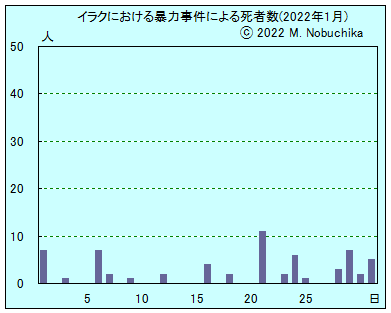 | 1.29 | モスル旧市街でISに殺害されたと思われる2人の死体発見。(NINA) バグダッド南方マフムディヤで不発弾の爆発により子ども2人死亡。(NINA) バビル州北部ブスタナ地域で爆発により民間人3人死亡。(NINA) バグダッド北郊タルミヤでISがシーア派民兵部隊を攻撃,イラク軍が空爆で応戦。(NINA) アンバル州西部クバイサ地区で治安部隊がISの隠れ家のトンネルを発見し破壊。(NINA) イラク軍の空爆により21日にディヤラ州アドハイム地区のイラク軍基地を攻撃しイラク兵11人を殺害した事件に関与したISメンバー9人死亡。(NINA) |
