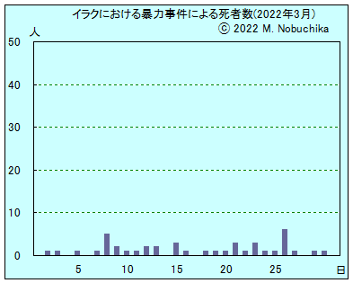 | 3.30 | ワシト州ヌマニヤ地区で武装集団が民家を襲撃し男性1人死亡,家族3人負傷。(NINA) バビル州北部ジュルフ・アルナスルでIED攻撃によりシーア派民兵2人負傷。(NINA) バクバ北東ジャラウラ郊外でIED攻撃により農夫2人負傷。(NINA) バグダッドでシーア派民兵部隊がIS幹部1人を逮捕。(NINA) モスル北方のトルコ軍ジルカン基地にミサイルが着弾,損害等の詳細未発表。(NINA) ダホク州アマディヤ地区でトルコ軍がクルド労働者党拠点を空爆。(NINA) |