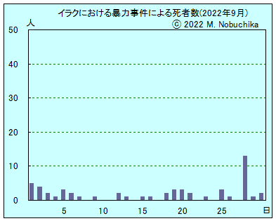 | 9.20 | バクバ北東シャーウィン地区の競技場でISの攻撃により民間人1人死亡,3人負傷。(NINA) モスル南方ガズラニ地域で部族間抗争により1人死亡,3人負傷。(NINA) バグダッド北西サバアルブール地区で武装集団同士の交戦により女性1人死亡,2人負傷。(NINA) バグダッド南東マシュタル地域で武装集団の銃撃により2人負傷。(NINA) バクバ北東シャーウィン地域でシーア派民兵部隊がISの攻撃を撃退。(NINA) |