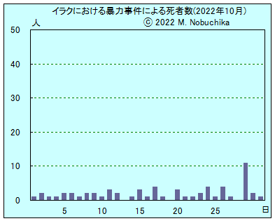 | 10.23 | バグダッド東部サドルシティで武装集団同士の交戦により1人死亡,3人負傷。(NINA) バグダッド東部ファディリヤ地域で武装集団同士の交戦により1人死亡,3人負傷。(NINA) 北部地域でトルコ軍の作戦行動によりクルド労働者党(PKK)戦闘員3人死亡,トルコ国防省発表。(NINA) |
