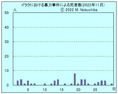 | 11.22 | モスル西部ザンジリ地域で民間防衛隊が3人の他殺体を発見。(NINA) バグダッド東部オバイディ地域で武装集団同士の交戦により1人死亡,4人負傷。(NINA) バグダッド東部バラディヤット地域で武装集団の銃撃と手榴弾攻撃により治安部隊員2人負傷。(NINA) |