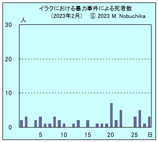 「暴力事件」などによる2月のイラク人の死者52人(28日まで)。