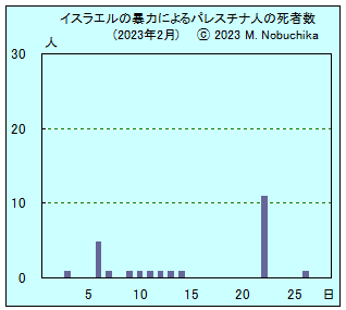 イスラエル軍や警察の発砲などによる2月のパレスチナ人の死者25人,パレスチナ人の襲撃などによるイスラエル人の死者6人(28日まで)。