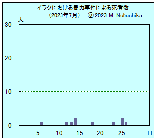 | 7.18 | キルクークの警察幹部宅への武装集団の銃撃により治安部隊員1人死亡。(NINA) バスラ西方サフワン地区で不発弾の爆発により子ども2人負傷。(NINA) キルクーク西方リヤド地区でイラク軍の空爆によりISメンバー5人死亡。(NINA) バクバ北東カナキン地域でシーア派民兵部隊がIS残存勢力追跡作戦を実施。(NINA) アンバル州西部カイムで治安部隊がISメンバー2人を逮捕。(NINA) サーマッラ地域で警察がISメンバー容疑者2人ウィ逮捕。(NINA) |