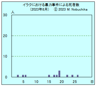 | 8.19 | モスル東部サマハ地区でISの残したロケット弾の爆発により子ども1人死亡,1人負傷。(NINA) バクバ北東アブサイダ地区で武装集団の銃撃により警官1人死亡。(NINA) アマラで二輪車に乗った武装集団の銃撃により民間人1人死亡。(NINA) キルクーク地域でシーア派民兵部隊がIS残存勢力追跡作戦を実施。(NINA) |