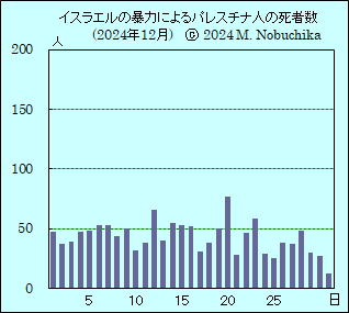 イスラエル軍の攻撃や警官の発砲などによる12月のパレスチナ人の死者1,328人(ガザ地区で1,319人,ヨルダン川西岸地区で19人),パレスチナ人側(レバノンのヒズボラ含む)の攻撃などによるイスラエル人の死者21人(31日まで)。