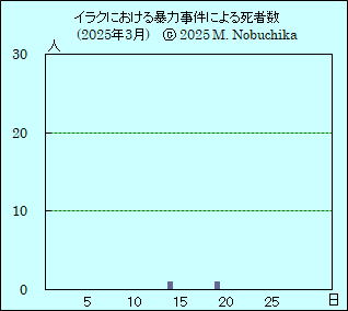 | 3.19 | ディワニヤ中心部で警察と武装集団の交戦により警官1人死亡,1人負傷。(NINA) サラハディン州東部で治安部隊の作戦行動によりISメンバー2人死亡,4人逮捕。(NINA) ニナワ州北西部シンジャル地域で手榴弾攻撃により治安部隊員3人負傷。(NINA) アンバル州の砂漠地帯でイラク軍がISの隠れ家を発見し兵器や兵站物資などを押収。(NINA) |