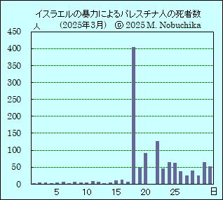 [パレスチナ情勢] ガザ保健省(GMH)が過去24時間のガザ地区へのイスラエル軍の侵攻の結果としてのパレスチナ人の死者は61人(うち4人は瓦礫の下などから発見),負傷者は134人,2023年10月7日以降のイスラエル軍の攻撃によるガザ地区のパレスチナ人の累計死者数は50,082人,負傷者は113,408人と発表。(GMH) ガザ地区各地へのイスラエル軍の空爆と砲撃によりパレスチナ人少なくとも65人死亡,保健当局発表,南部ハンユニスの民家や避難テントへの空爆により少なくとも16人死亡,北部ガザ市東部シェジャイアで砲撃により4人死亡,パレスチナ・メディア報道。(R) ヨルダン川西岸地区ヘブロン近郊マサフェルヤッタでユダヤ人入植者の集団がパレスチナ人を襲撃しアカデミー賞を受賞したドキュメンタリー映画「ノー・アザー・ランド(故郷は他にない)」の共同監督のハムダン・バラール氏らに暴行,負傷した同氏はイスラエル兵が拉致。(AP)(R)(3) イスラエル北部のバス停でイスラエル市民のアラブ人の銃撃とナイフによる襲撃によりイスラエル人1人死亡,イスラエル兵1人負傷,警官の発砲により襲撃者死亡。(R) イエメンのフーシ派がイスラエル西部テルアビブのベングリオン空港を超音速ミサイルで攻撃し標的に命中したと発表,イエメン西部サヌアで米軍の空爆により1人死亡,13人負傷,フーシ派保健当局発表。(NINA)(K) イスラエル軍がエルサレムやテルアビブ地域標的にイエメンのフーシ派が発射したミサイルを迎撃したと発表。(R) |