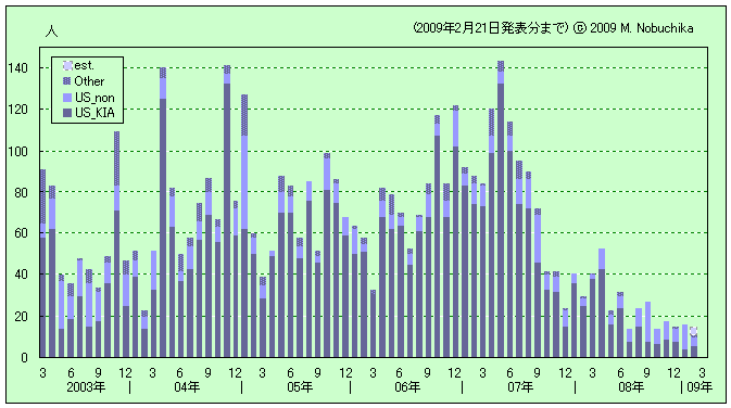 *イラク多国籍軍兵士の死者の月別の推移は下の第1図,イラク民間人の死者の月別の推移は下の第2図を参照していただきたい。最新のデータは【イラク戦争における犠牲者】をご覧ください。